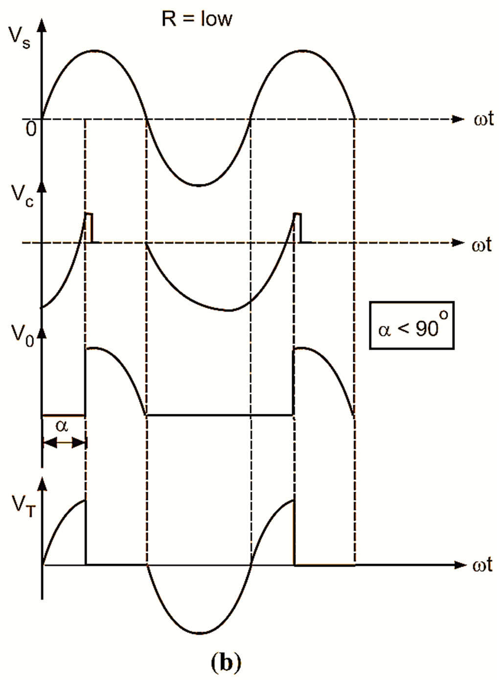 Fig. 2 shows voltage waveforms for RC trigger circuit for different values of R. When SCR turns ON, its ON-state voltage drop is approximately 1 V. This low voltage across SCR during turn-ON period keeps capacitor C discharged in positive half cycle until negative voltage cycle across C appears. When value of resistance R is high, the time taken by capacitor C to charge to required gate voltage is more because charging current is low. Therefore, firing angle α is more and output voltage Vo is less. Thus the output voltage Vo is inversely proportional to the firing angle α.